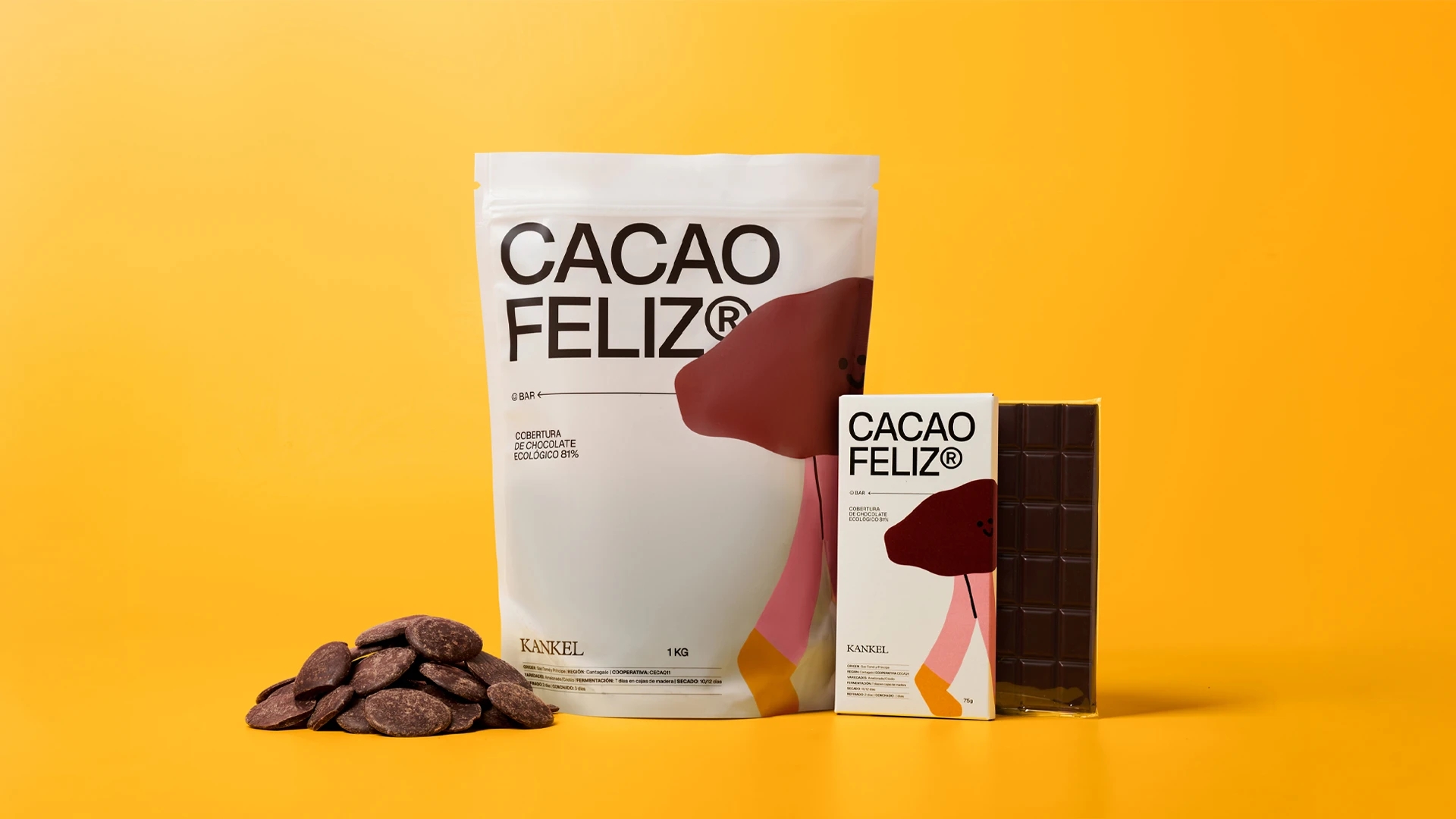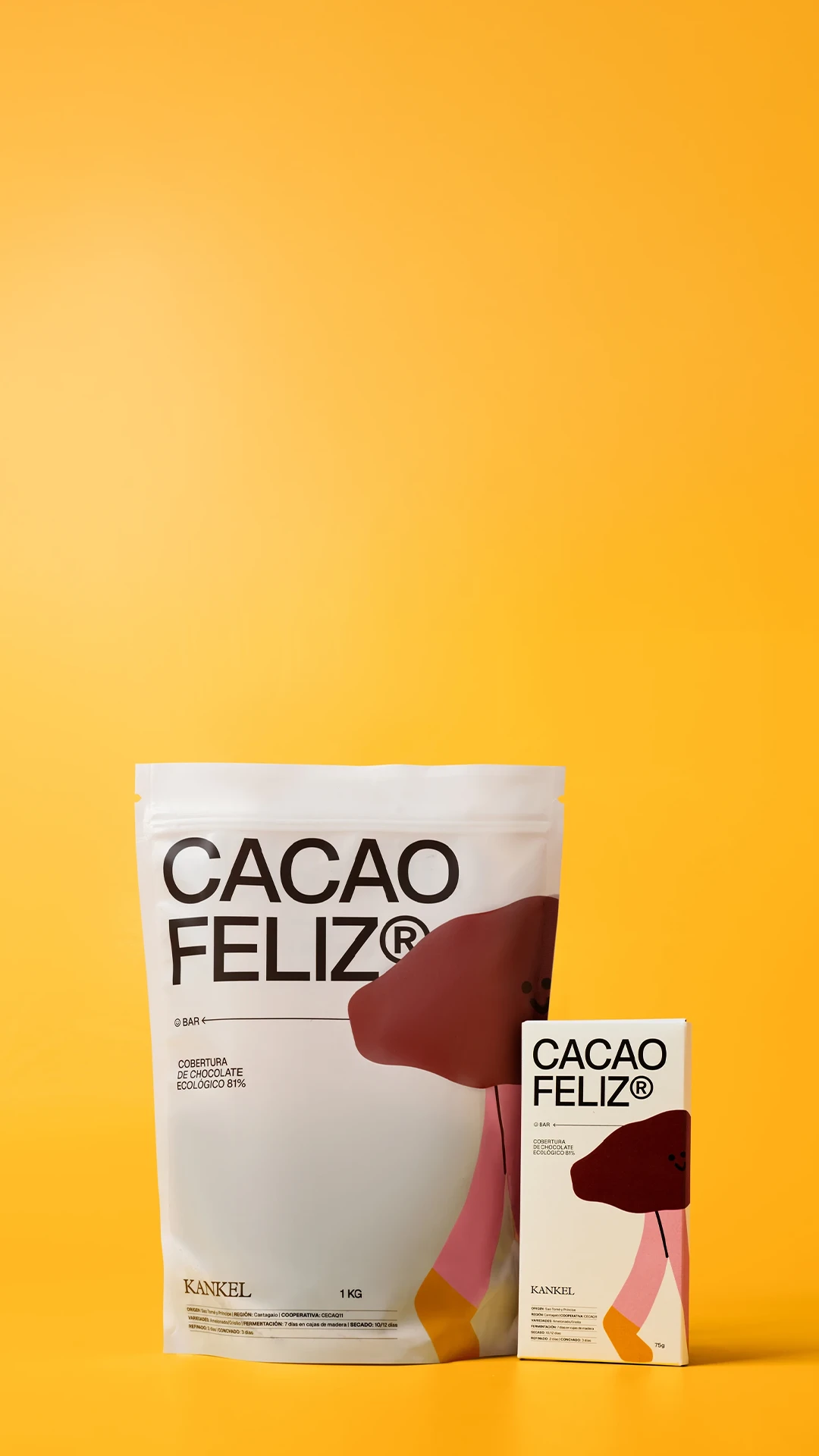 Cacao Feliz® se comercializa en dos formatos: bolsa de 1kg de cobertura, y tableta de 75 gr.